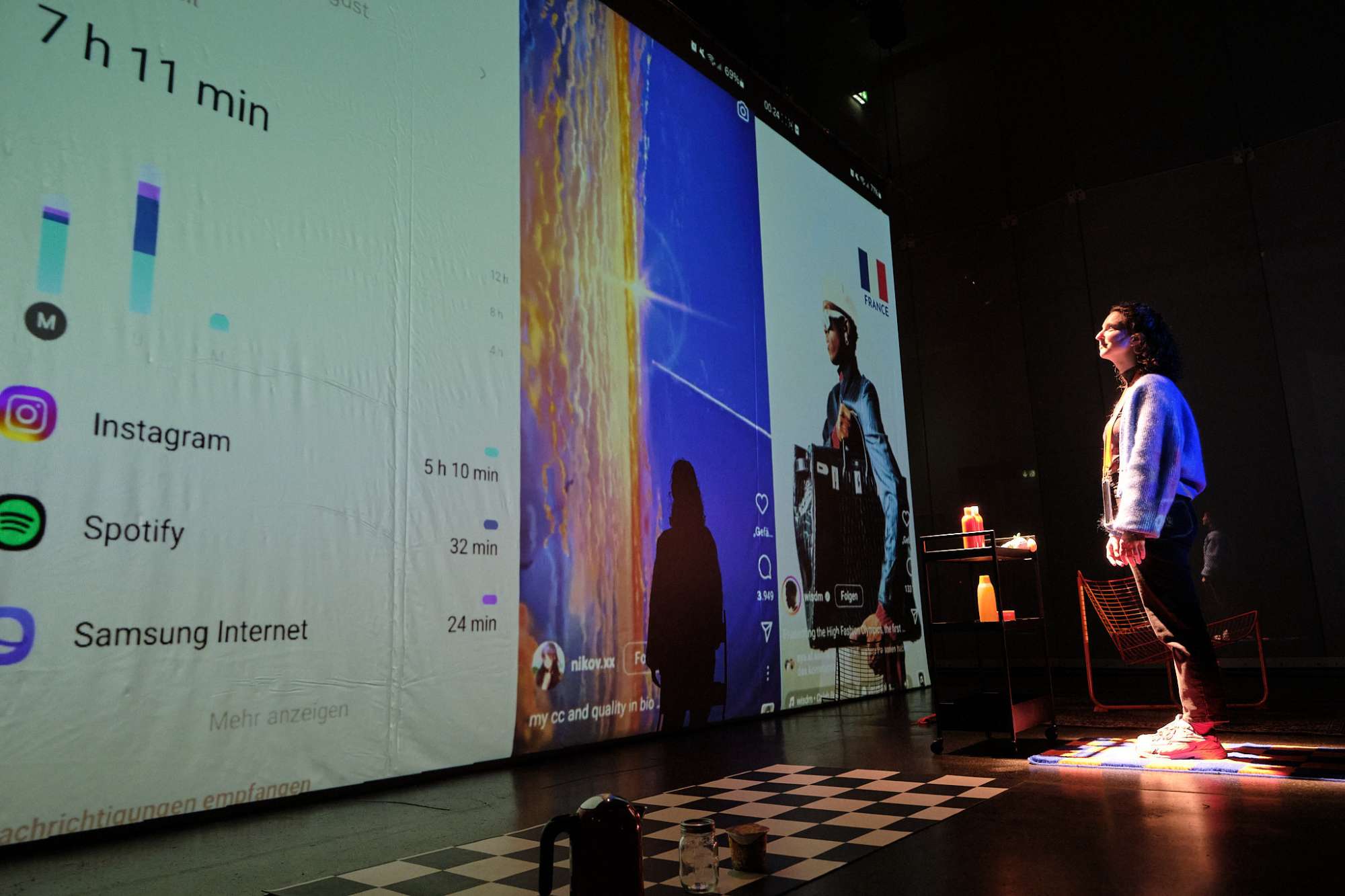 Multilingual: The performance features German and English surtitles and presents multilingual social media posts.