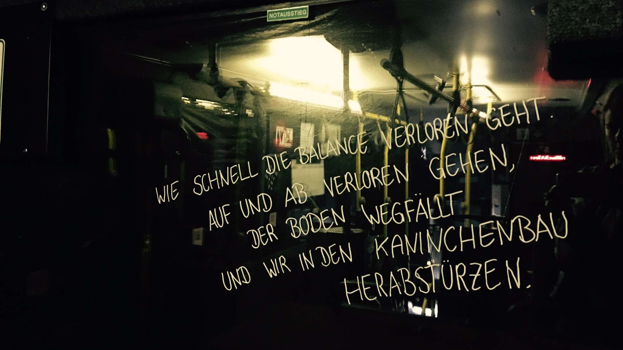 “Es ist unfassbar, wie schnell die Dinge verrutschen… Wie schnell die Balance verloren geht, Auf und Ab verloren gehen, der Boden wegfällt und wir in den Kaninchenbau herabstürzen.” Zitat aus dem Stück von Allex. (Liat) Fassberg
